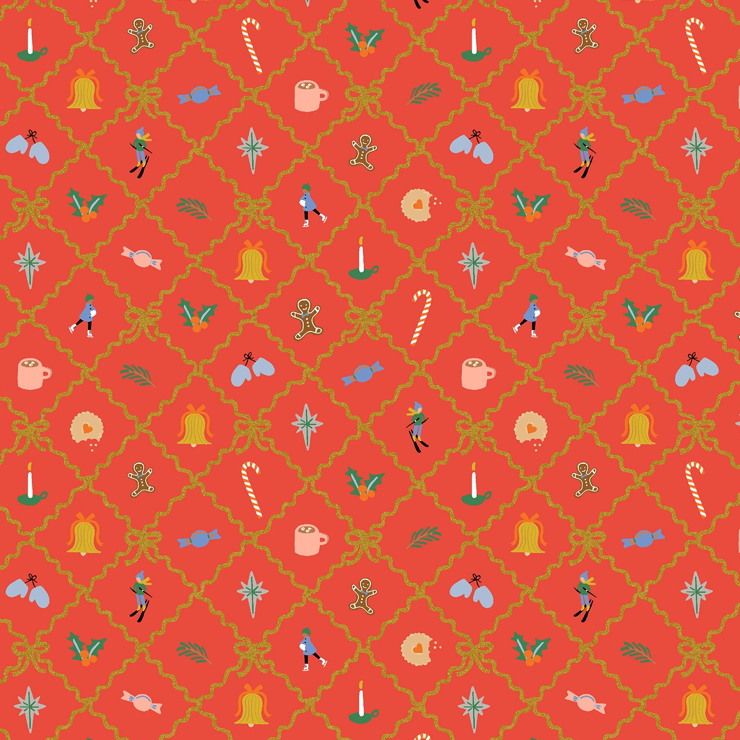 Rifle Paper Co, Holiday Classics - Holiday Argyle - Red and Metallic Gold Fabric, 1/4 yard