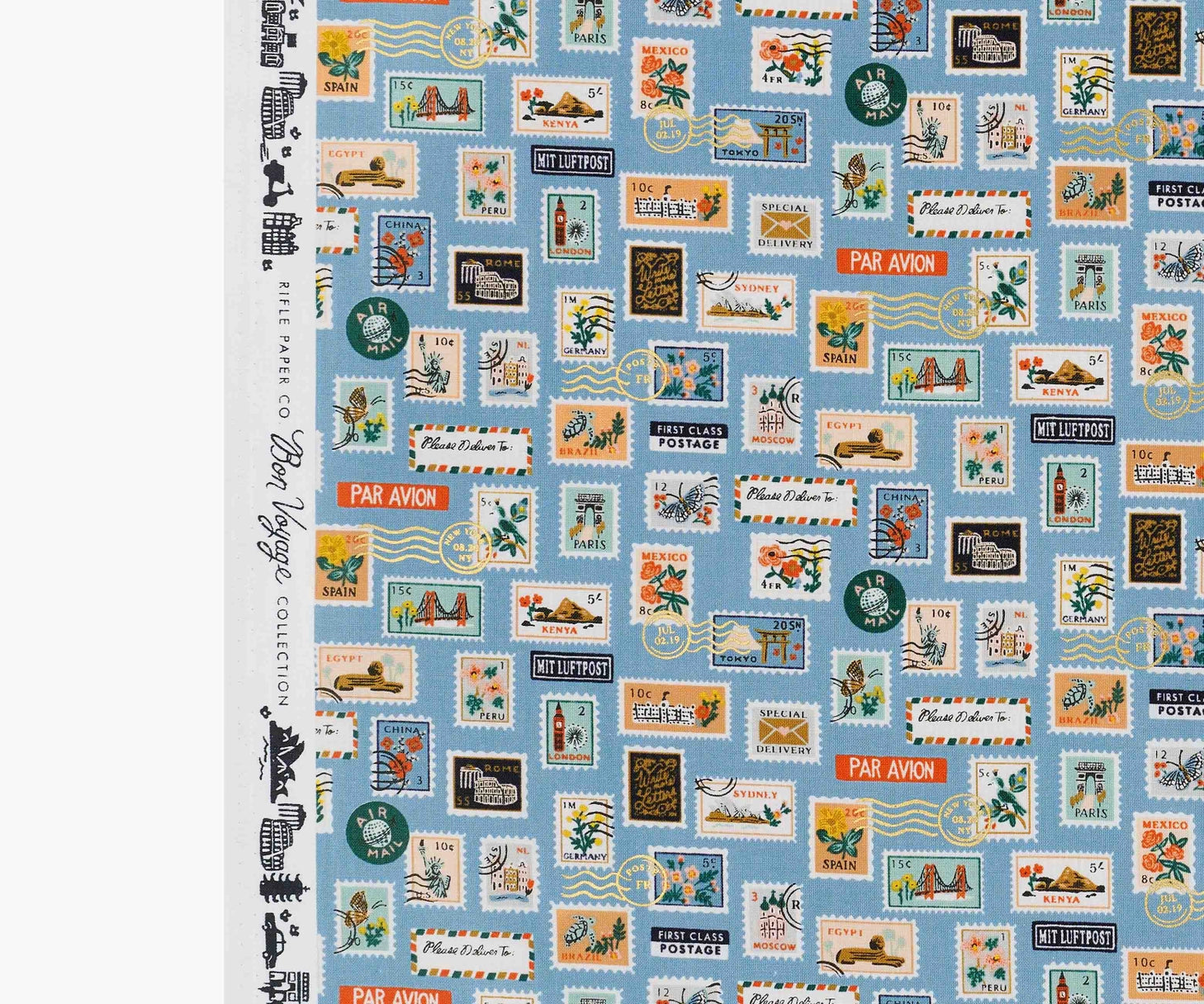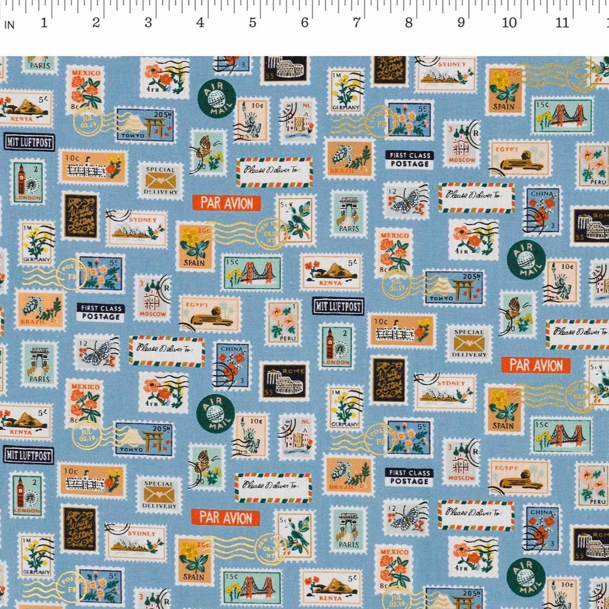 Rifle Paper Co, Bon Voyage - Postage Stamps -Blue Metallic Fabric, 1/4 yard