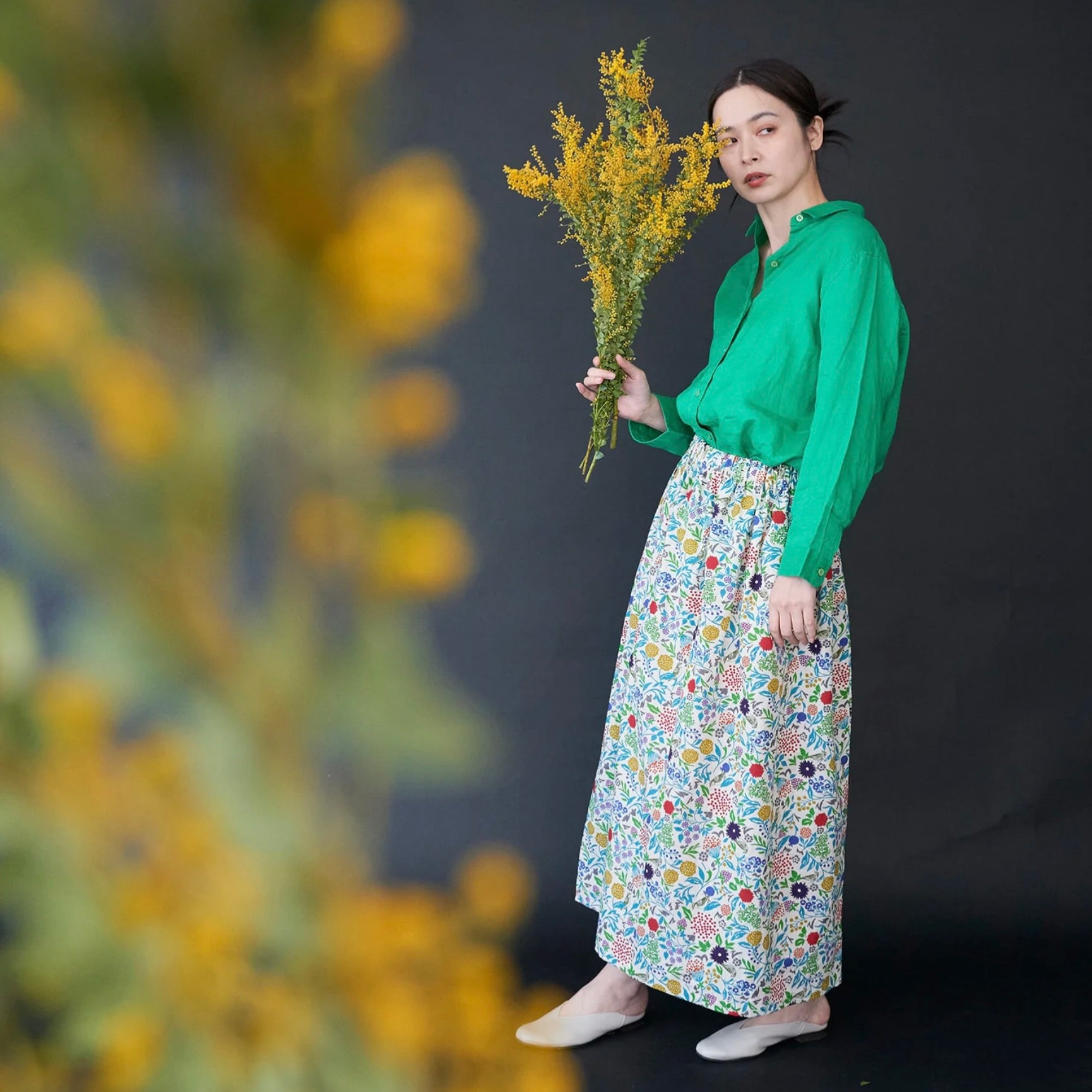 Kokka Flownny Petit Flowers, Japanese Cotton, Green on White, 1/4 yard